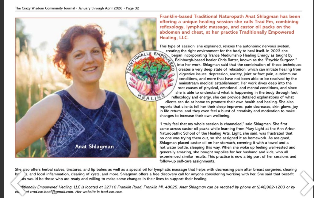 Traditionally Empowered Healing LLC (Trad Emยฎ) has been established since 2012 by Traditional Naturopath Anat Shlagman offering Sessions, Herbal remedies and Workshops to promote natural healing. We emphasize on Relaxation, Touch and Nourishment.